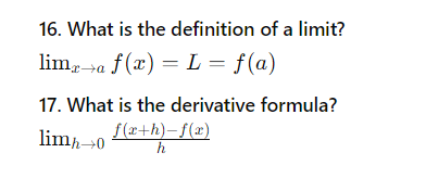 limh→0f(x+h)−f(x)h\lim_{h \to 0} \frac{f(x + h) – f(x)}{h}